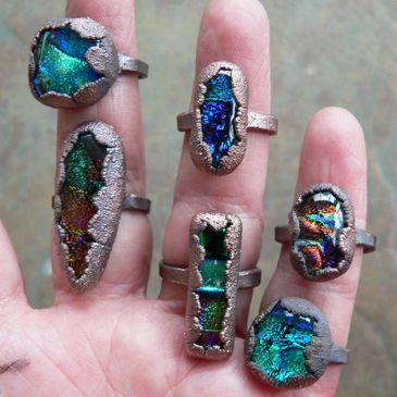 These rings were so much fun They were a part of the Archeology Collection. We sculptured the form and created an electrical field to move copper from a plate to our designed places.